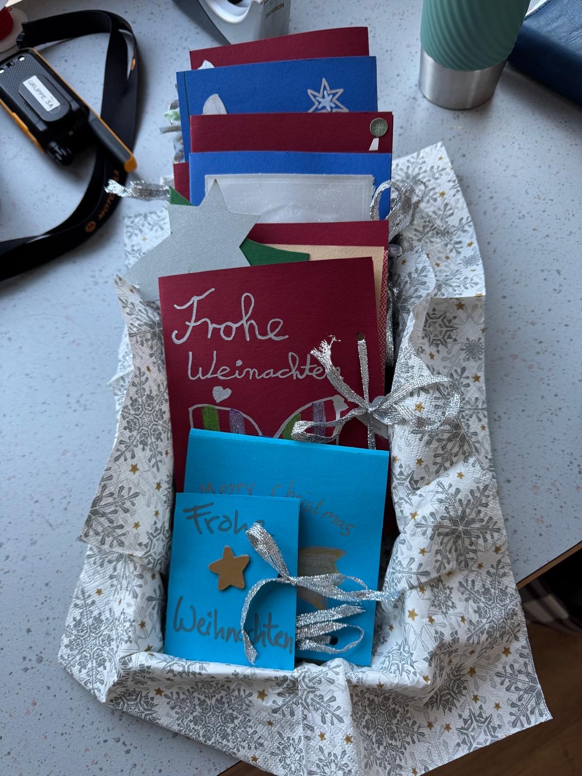 Die OGS Hoisdorfer Erdmännchen wollten den älteren Herrschaften in der Seniorenresidenz „Zum Hoisdorfer Teich“ gerne zu Weihnachten eine Freude bereiten – kreativ, mit Herz und selbstgemacht sollte es sein. Und auch zum Anfassen und dekorieren in der Weihnachtszeit! So bastelten die Kinder mit den Betreuer*innen in der Vorweihnachtszeit „Pop-Up-Weihnachtskarten“ aus zweierlei gefaltetem Tonpapier in weihnachtlichen Farben. Dazu kam auch die Schneidemaschine im Lehrerzimmer zum wohlverdienten Einsatz! Die Pop-Ups wurden jeweils in der inneren Karte mit Kleber angebracht. So kamen beim Öffnen der Karten viele winterliche Weihnachtsmotive aufgeklappt zum Vorschein – darunter Weihnachtsbäume, Schneemänner und Sterne. Natürlich schön verziert mit viel Glitzer und Glamour sowie weihnachtlichen Bändern! Die kreative Weihnachtskartensammlung wurde schließlich am 17. Dezember pünktlich zur Weihnachtsfeier in der Seniorenresidenz an die Leiterin der Einrichtung überreicht. „Die Verbindung von jung und alt über so schöne Weihnachtskarten ist eine ganz tolle Sache!“